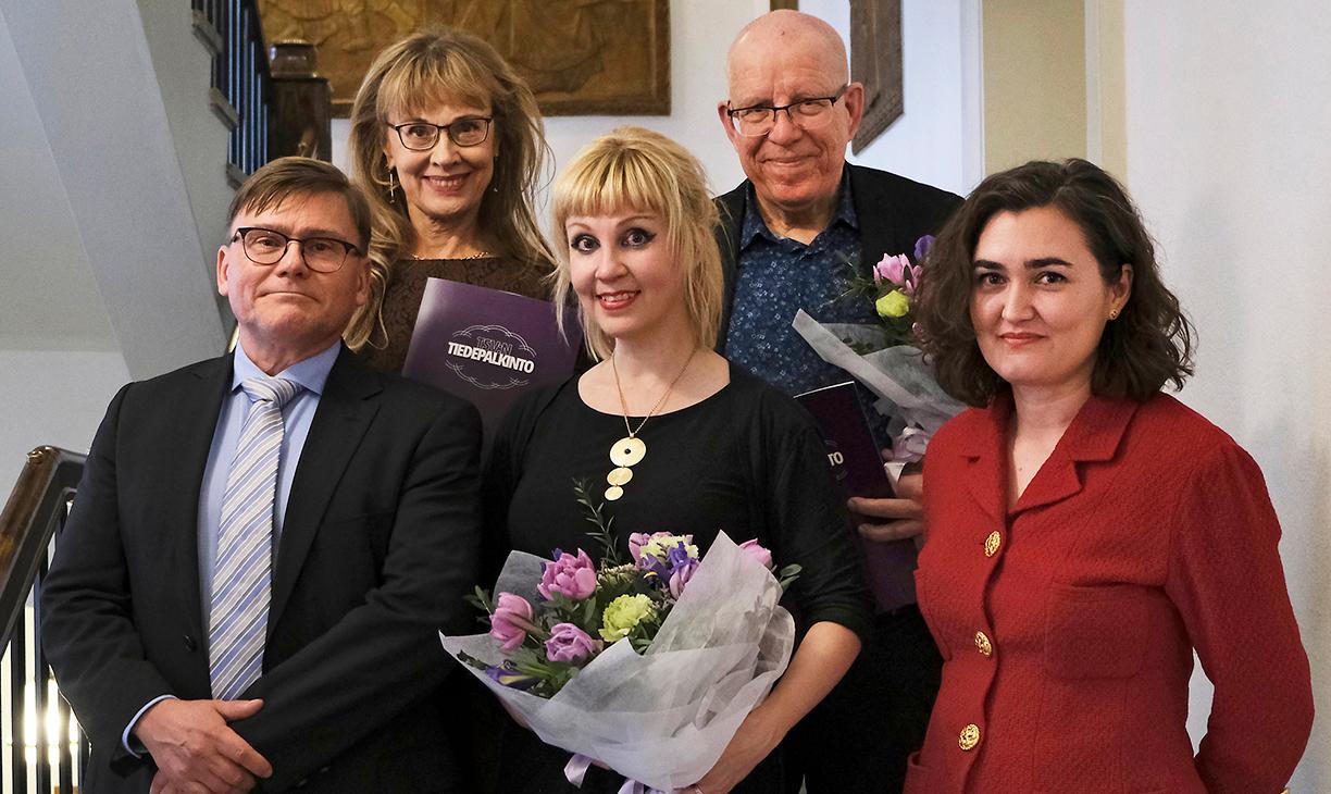 Kuvassa Tapio Onnela (oikealla ylhäällä) sekä Tuire Ranta-Myer (vasemmalla ylhäällä), Milla Tiainen (keskellä alhaalla) ja Meri Kytö (oikealla alhaalla), jotka vastaanottivat palkinnon Suomen musiikkitieteellisen seuran puolesta. Palkinnon jakoi Tieteellisten seurain valtuuskunnan hallituksen puheenjohtaja Petri Karonen (vasemmalla alhaalla). Kuvan lähde: Tieteellisten seurain valtuuskunta.