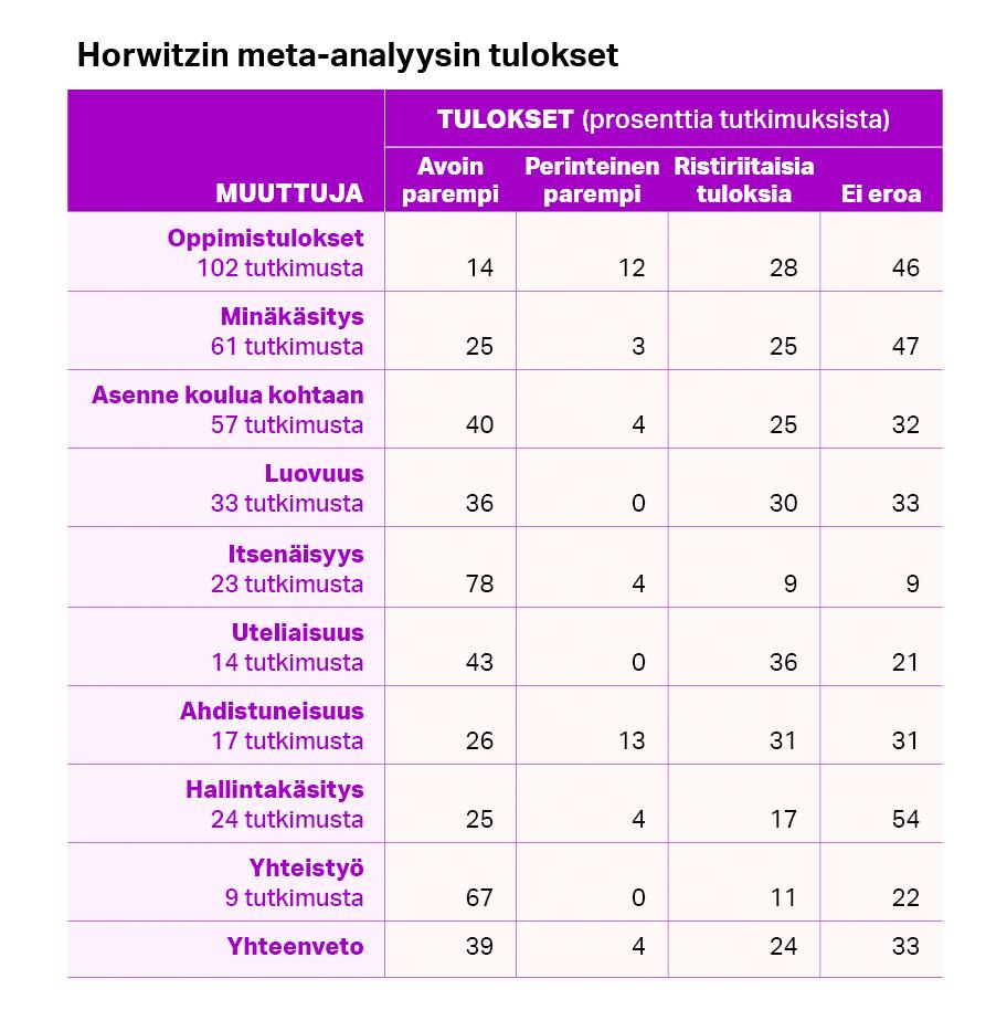 Horwitzin meta-analyysissa kävi ilmi, että oppimistulokset olivat avoimessa opetuksessa ja niin sanotussa perinteisessä opetuksessa yhtä hyviä. Avoin opetus kuitenkin edisti opettajajohtoista opetusta paremmin oppilaiden myönteistä minäkäsitystä, koulusta pitämistä, luovuutta, itsenäisyyttä, uteliaisuutta, hallintakäsitystä ja yhteistyötä.