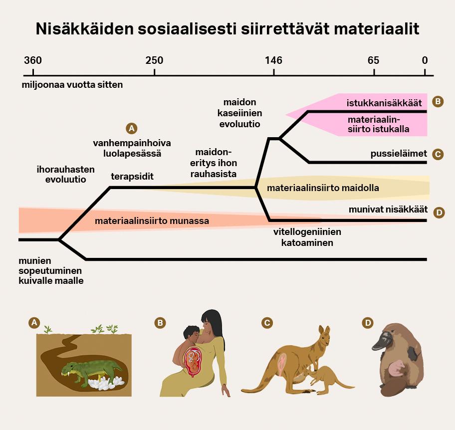 Nisäkkäiden evolutiiviset innovaatiot, ensin maito ja sitten materiaalinsiirto istukan kautta, mahdollistivat emolle yhä tehokkaamman, nopeasti muuteltavan ja pitkäkestoisen keinon hallinnoida jälkeläisen kehitystä. Näiden piirteiden evoluutio mahdollisti myös muita jälkeläisten hoivaamiseen ja sosiaalisuuteen liittyviä käyttäytymispiirteitä, jotka ovat sittemmin tehneet meistä nisäkkäistä niin menestyksekkäitä.
